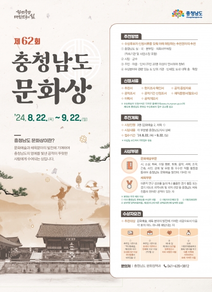 [충청중심뉴스] 충남도는 다음달 22일까지 ‘제62회 충청남도 문화상’ 후보자를 공개 추천받는다고 20일 밝혔다.