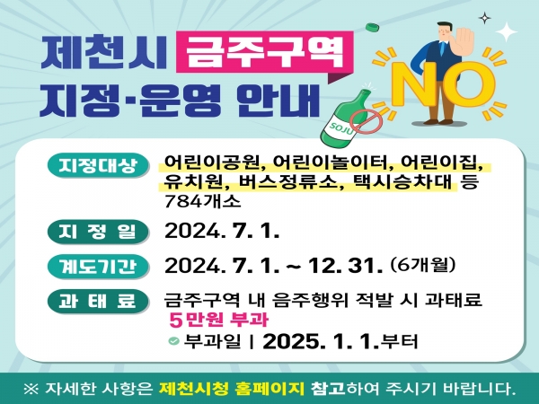 금주 구역은 ‘국민건강증진법’과‘제천시 건전한 음주문화 환경조성 및 지원에 관한 조례’ 제4조에 따라 지정됐으며 어린이공원, 어린이놀이터, 어린이집, 유치원, 버스정류소, 택시승차대 총 784개소이다.