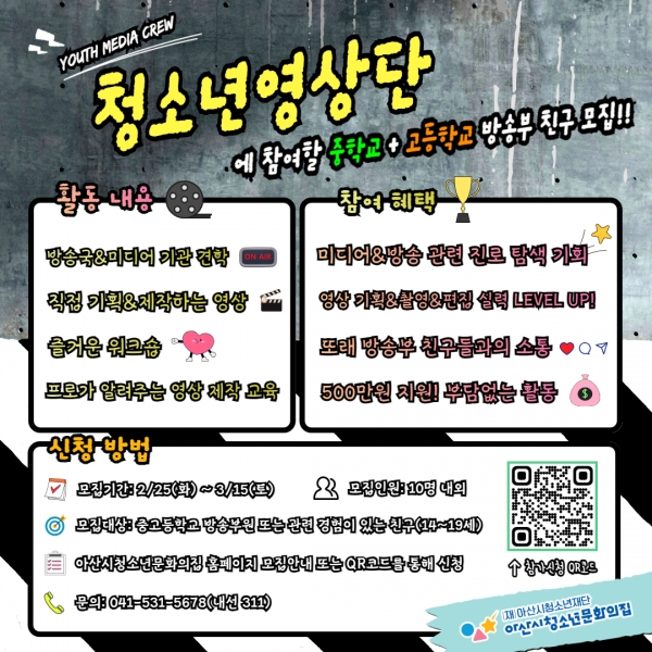 모집 기간은 2025년 2월 25일부터 3월 15일까지이며 아산시청소년문화의집 홈페이지를 통해 지원 가능하다.