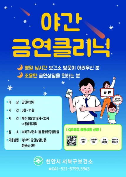 [충청중심뉴스] 천안시 서북구보건소는 오는 3월부터 야간 금연클리닉을 운영한다고 28일 밝혔다.