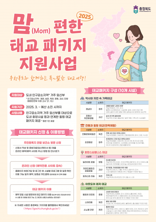 올해 태교패키지 지원사업에 참여하는 시설은 △청남대, △초정행궁, △포레스트 리솜, △스테리움, △전통문화체험관, △일라이트 호텔, △벨포레 리조트, △조령산자연휴양림, △자연드림파크 로움호텔, △소노벨 단양 10곳이다.