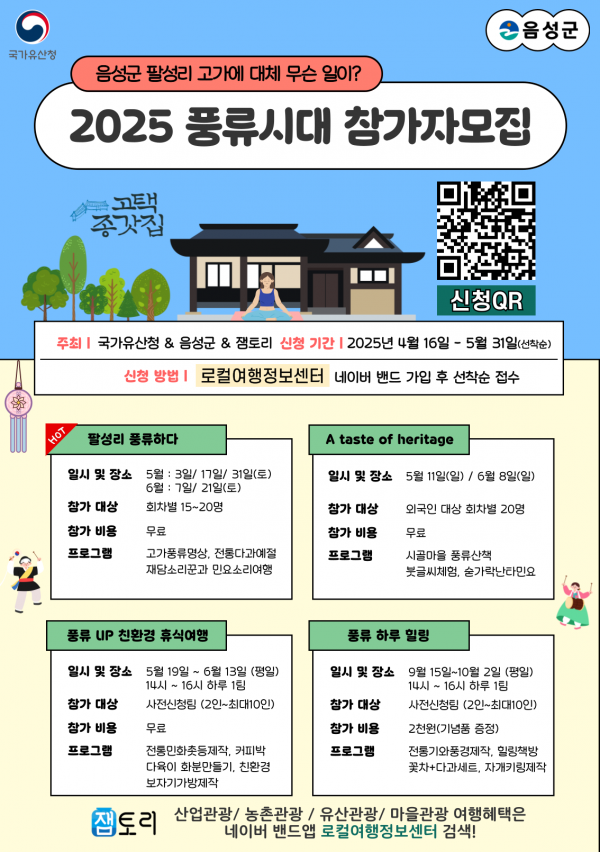 [충청중심뉴스] 음성군은 ㈜잼토리와 함께 국가유산청 공모사업으로 선정된 고택·종갓집 활용사업 ‘팔성리 풍류시대’를 생극면에 위치한 ‘음성 팔성리 고가’에서 오는 5월부터 본격적으로 진행한다고 16일 밝혔다.