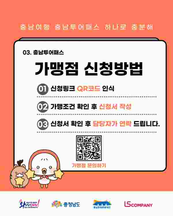 가맹점 신청은 충남투어패스 홍보문 내 정보무늬를 통해 가능하며 천안에 위치한 업체라면 어느 곳이든 가능하다.
