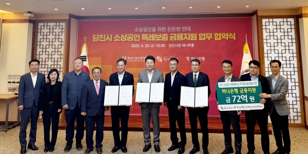 이번 협약에 오성환 당진시장, 함종덕 하나은행 충남북영업본부 지역대표, 조소행 충남신보 이사장이 참석해 당진시 소상공인의 경영 안정과 지역경제 활성화를 위한 상호 협력 의지를 다졌다.