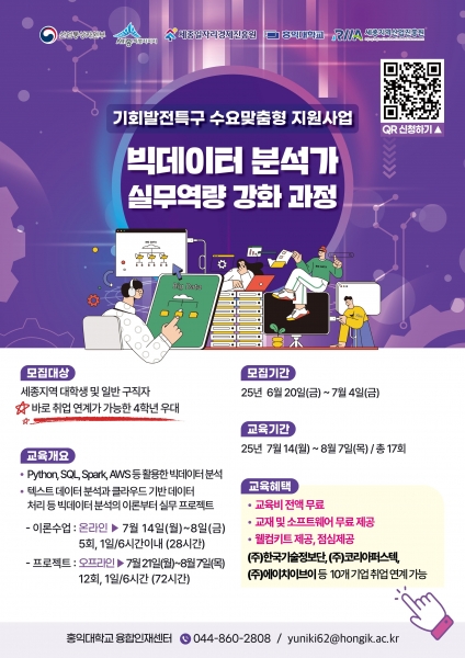 김현기 경제산업국장은 “이번 교육을 통해 세종시 인재들이 빅데이터 분야에서 전문성을 갖추고 지역 기업의 인력 수요에도 부응할 수 있을 것”이라며 “청년 일자리 창출과 지역경제 활성화를 위해 다양한 지원에 나서겠다”고 말했다.