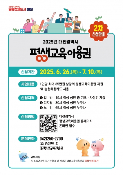 [충청중심뉴스] 대전시와 대전평생교육진흥원은 시민의 평생학습 참여를 확대하고 교육 격차 해소를 위해 ‘평생교육이용권’ 2차 지원 대상자 1,015명을 오는 6월 26일부터 7월 10일까지 모집한다고 밝혔다.