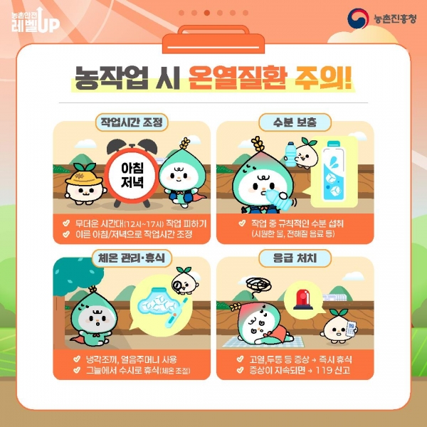 농기센터에서는 폭염특보 발효 시 농업인에게 온열질환 예방문자를 발공하고 있으며 현장 방문 시 온열질환 예방수칙 안내 및 보냉용품 활용법 교육을 실시하고 있다.
