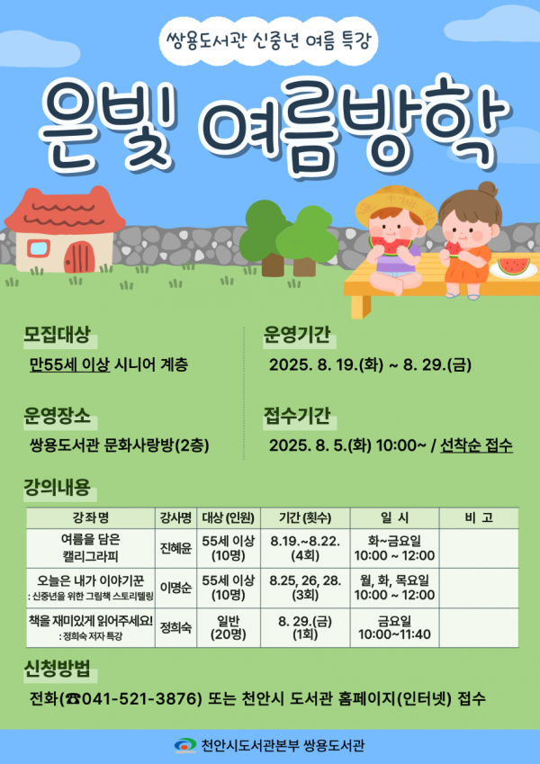[충청중심뉴스] 천안시 쌍용도서관은 오는 8월부터 55세 이상 신중년 대상 ‘은빛 여름방학’ 프로그램을 운영한다고 31일 밝혔다.