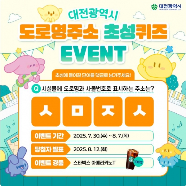[충청중심뉴스] 대전시는 도로명주소에 대한 시민의 관심을 높이고 쉽고 재미있게 도로명주소를 익힐 수 있도록 이달 7일까지 ‘도로명주소 초성퀴즈 이벤트’를 진행한다.