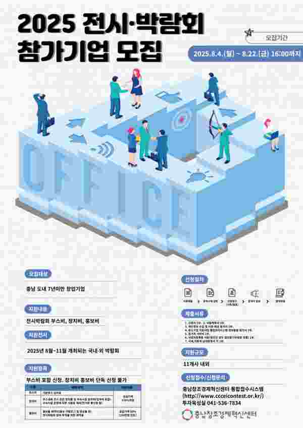 [충청중심뉴스] 충남창조경제혁신센터는 충남 도내 7년 미만 창업기업을 대상으로 ‘2025년 전시·박람회 참가기업 지원사업’ 참가기업을 오는 8월 4일부터 8월 22일까지 모집한다고 밝혔다.