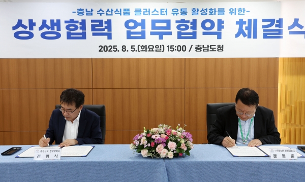 도는 5일 도청 회의실에서 전형식 정무부지사와 문동춘 ㈜은하수산 경영총괄 사장 등이 참석한 가운데, ‘충남 수산식품 클러스터 유통 활성화를 위한 상생협력 업무협약’을 체결했다고 밝혔다.