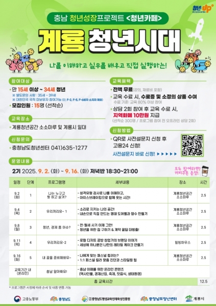 ‘계룡청년시대 2기’는 오는 9월 2일부터 3주간 총 5회차로 운영되며 참여자들은 자기 이해부터 실전 취업 준비까지 개인의 성장을 체계적으로 지원받을 수 있다.