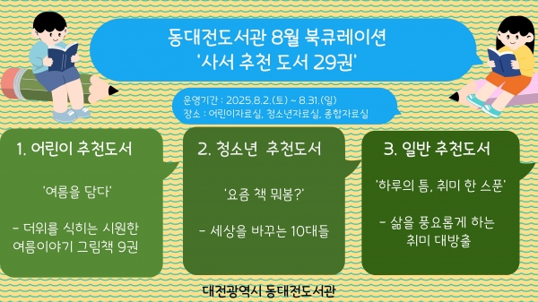 [충청중심뉴스] 동대전도서관은 8월 한 달 동안 연령별 맞춤형 북큐레이션 프로그램 ‘사서 추천 도서 29권’을 운영한다.