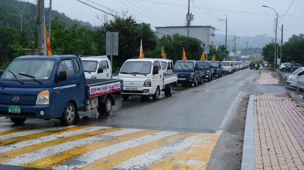 행진은 영동체육관에서 발대식을 시작으로 △영동역 △설계리 △용산면 △샘표식품 △심천면 △초강리 △영동 로터리를 거쳐 하상 주차장 인라인스케이트장까지 약 25km 구간에서 서행 차량 시위로 진행됐다.