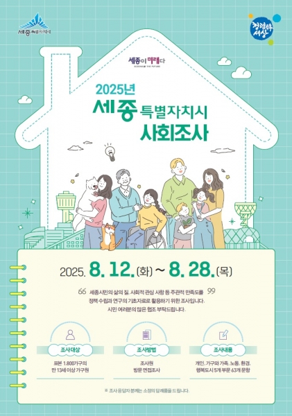 [충청중심뉴스] 세종시가 오는 8월 12일부터 28일까지 17일간 표본 1,800가구를 대상으로 ‘2025년 세종시 사회조사’를 실시한다.