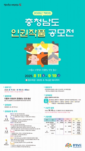 [충청중심뉴스] 충남도는 오는 9월 19일까지 ‘제10회 충청남도 인권작품 공모전’ 작품을 접수받는다고 11일 밝혔다.