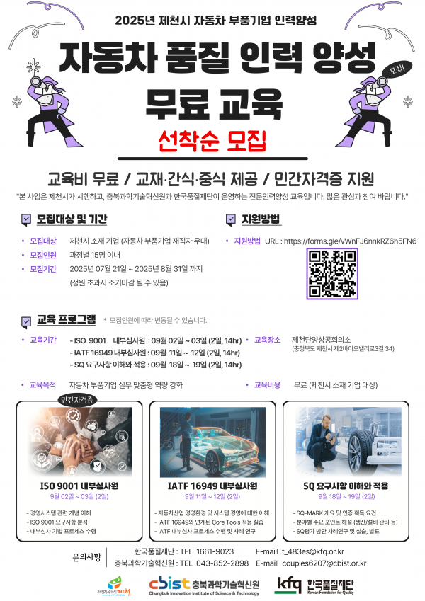 [충청중심뉴스] 제천시는 지역 자동차 부품기업 재직자의 직무 전문성 향상을 위해 한국품질재단이 운영하는 ‘자동차 품질 전문인력 양성 교육’을 오는 9월 2일부터 실시한다고 밝혔다.