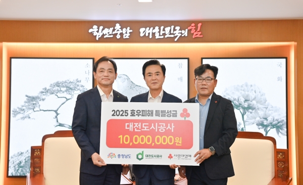 도는 11일 도청 외부접견실에서 태화홀딩스, 대전지방공인회계사회, 대전도시공사, 대한곡물협회충남지회가 호우 피해복구 지원 성금으로 1억 6800만원을 기탁했다고 밝혔다.