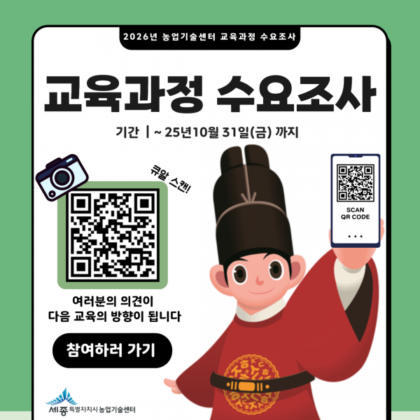 [충청중심뉴스] 세종시 농업기술센터가 오는 10월 31일까지 내년도 농업인 교육 방향을 설정하기 위해 관련 수요조사를 실시한다.
