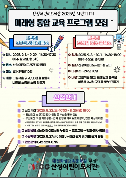 대전학생교육문화원 엄기표 원장은 “미래형 통합 교육 프로그램은 논리적 사고력과 창의력을 함양할 수 있는 좋은 기회가 될 것”이라며 “아이들이 도서관에서 각양각색의 꿈을 찾아가는 선물 같은 시간을 보내길 바란다”고 말했다.