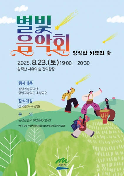 [충청중심뉴스] 계룡시는 오는 23일 오후 7시부터 8시 30분까지 향적산 치유의 숲 잔디광장에서 ‘향적산 치유의 숲 별빛음악회’를 개최한다고 밝혔다.