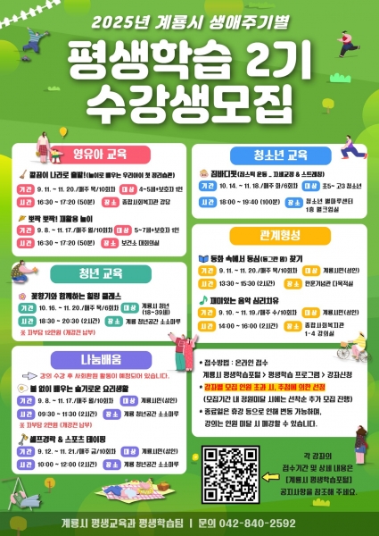 [충청중심뉴스] 계룡시는 오는 9월부터 11월까지 3개월간 ‘2025년 2기 생애주기별 맞춤형 평생학습 프로그램’을 운영한다고 밝혔다.