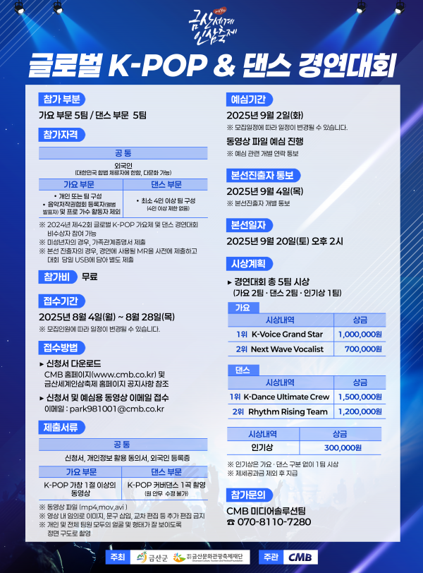 군 관계자는 “이번 대회는 ‘K-POP으로 하나 되는, 경연을 넘어 모두가 즐기는 글로벌 행사’를 모토로 추진된다”며 “K-POP과 댄스를 사랑하는 전 세계의 참가자들이 모여 함께 경연과 축제를 즐길 수 있는 특별한 무대를 만들 예정”이라고 말했다.