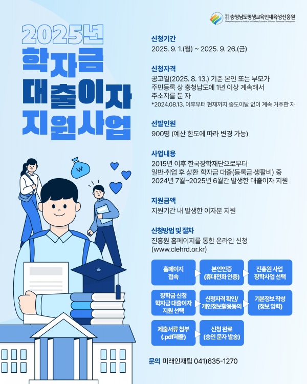 [충청중심뉴스] 충청남도평생교육인재육성진흥원은 학자금 대출로 인해 발생된 대출이자에 대해 도민의 경제적 부담을 덜고자, 오는 9월 1일부터 9월 26일까지 진흥원 홈페이지를 통해‘2025년 학자금 대출이자 지원사업' 신청 대상자를 모집한다.