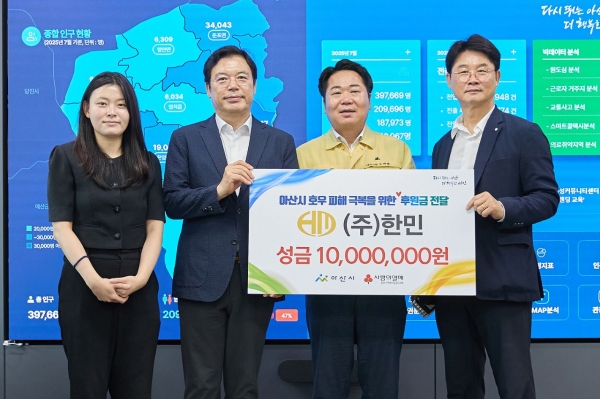 오세현 아산시장은 “한민의 따뜻한 나눔에 깊은 감사를 드리며 이번 기부가 호우 피해로 어려움을 겪고 있는 시민들에게 큰 힘이 될 것”이라고 말했다.