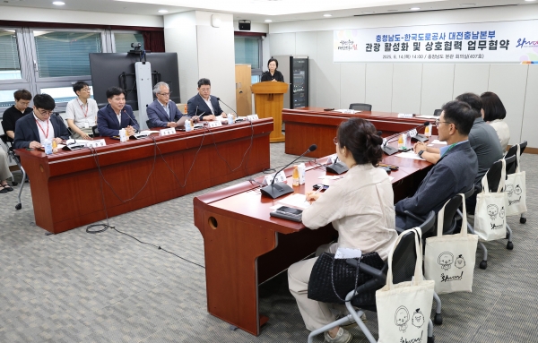 [충청중심뉴스] 충남도는 14일 도청에서 조일교 도 문화체육관광국장, 한정민 한국도로공사 대전충남본부 관리처장 등 관계자 10여명이 참석한 가운데, 한국도로공사 대전충남본부와 ‘2025∼2026 충남 방문의 해’의 성공을 위한 업무협약을 체결했다.