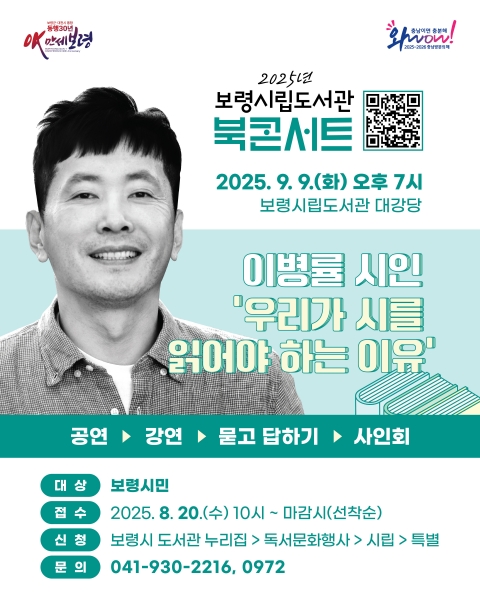 [충청중심뉴스] 보령시는 9월 9일 오후 7시 보령시립도서관 대강당에서 보령시민을 대상으로 이병률 시인 북콘서트를 개최한다고 밝혔다.