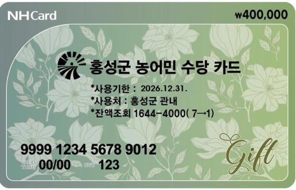 군은 지난 2월부터 읍·면 행정복지센터를 통해 농어민수당 지원신청을 접수받았으며 올해 지급대상자로 확정된 농업인 17,458명에 홍성군에서 사용 가능한 선불카드로 지급한다.