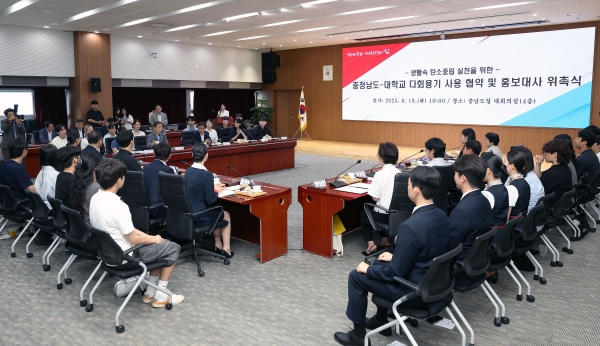 도는 19일 도청 대회의실에서 전형식 정무부지사를 비롯해 대학 총장단, 학생 홍보대사 및 관계자 등 150여명이 참석한 가운데 ‘대학교 다회용기 사용 협약 및 홍보대사 위촉식’을 개최했다고 밝혔다.