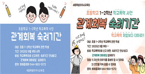 [충청중심뉴스] 세종시교육청 학교지원본부는 2025년 9월부터 관내 초등학교 1~2학년 학생을 대상으로 ‘관계회복 숙려기간’ 시범 운영을 전격 도입한다.