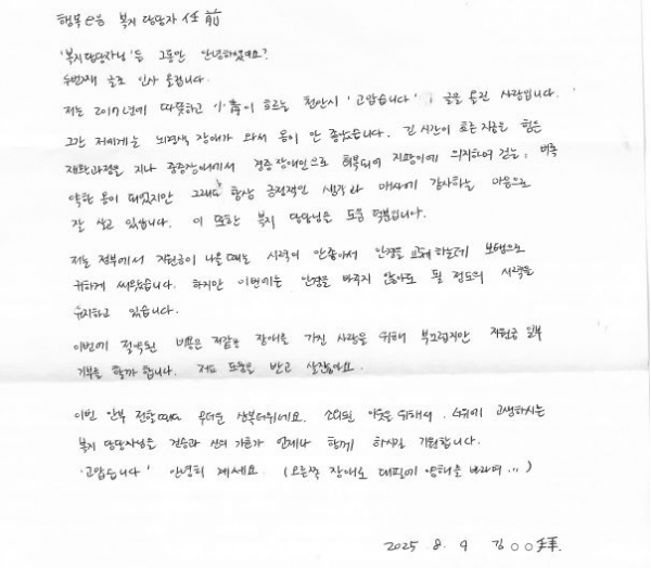 천안시는 중증장애인이면서 기초생활수급자인 김 모 씨는 편지를 통해 과거 생활의 어려움을 천안시 복지서비스를 통해 극복할 수 있었다고 밝히며 이 과정에서 도움을 준 복지담당자의 노고에 감사를 표했다.