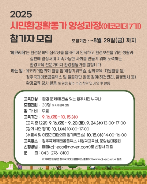 [충청중심뉴스] 청주시 환경교육센터인 청주국제에코콤플렉스에서는 오는 29일까지 2025시민환경활동가 양성과정에 참여할 참가자를 모집한다.