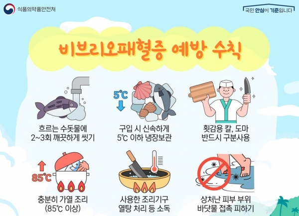 이를 예방하기 위해서는 어패류를 충분히 익혀서 섭취하고 상처가 난 피부 부위는 바닷물 접촉을 조심해야 한다.