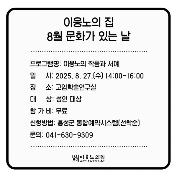 이번 행사는 홍성군 통합예약시스템을 통해 사전 신청할 수 있으며 오전 10시 도슨트 해설을 시작으로 오후 2시에는 이응노 화백의 작품 세계를 직접 체험하는 서예 프로그램이 진행된다.