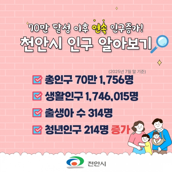 7월 말 기준 천안시의 총인구는 70만 1,756명이다.
