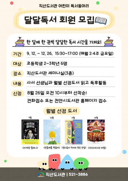 [충청중심뉴스] 천안직산도서관은 오는 9월 12일~ 12월 26일 어린이 독서동아리 ‘달달독서’를 운영한다고 21일 밝혔다.