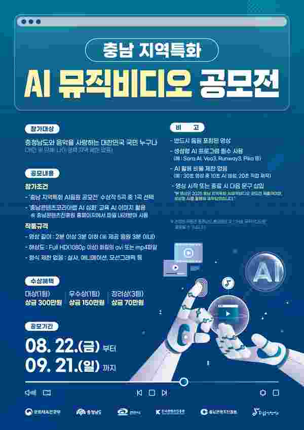 [충청중심뉴스] 충남콘텐츠진흥원이 운영하는 충남음악창작소가 ‘충남 지역특화 AI 뮤직비디오 공모전’ 참가자를 모집한다고 22일 밝혔다.