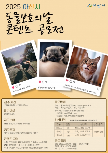 [충청중심뉴스] 아산시가 오는 10월 4일 ‘제1회 동물보호의 날’을 기념해 ‘2025 아산시 동물보호의 날 콘텐츠 공모전’을 연다.