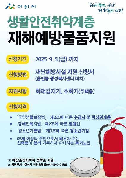 신청은 9월 5일까지 거주지 읍·면·동 행정복지센터에서 할 수 있으며 이후 아산소방서와 의용소방대가 직접 가정을 방문해 시설을 설치하고 안전 사용법을 안내할 예정이다.