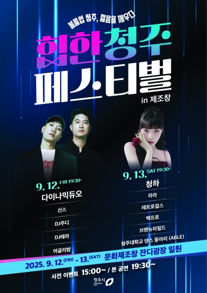 이어 13일에는 K팝 솔로 퀸 청하를 비롯해, 라라, 레트로걸스, 백프로 지역예술단체 브랜뉴차일드와 청주대학교 댄스동아리 ABLE이 축제의 열기를 이어간다.