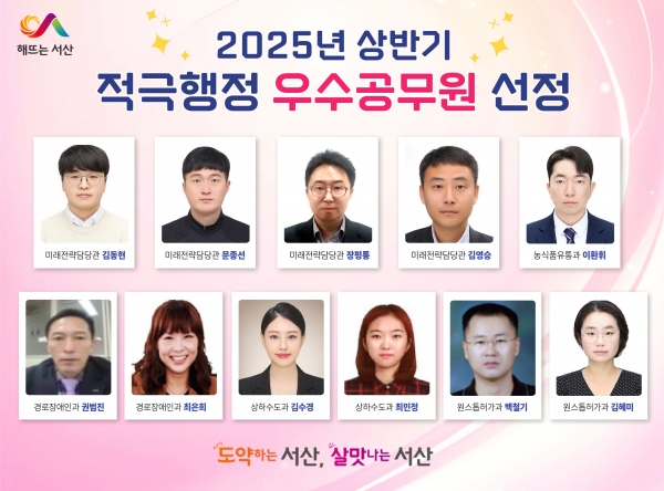 [충청중심뉴스] 충남 서산시는 ‘2025년 상반기 적극행정 우수사례’ 6건을 선정하고 창의성과 전문성을 바탕으로 이를 추진한 직원 11명을 적극행정 우수공무원으로 선정했다고 22일 밝혔다.