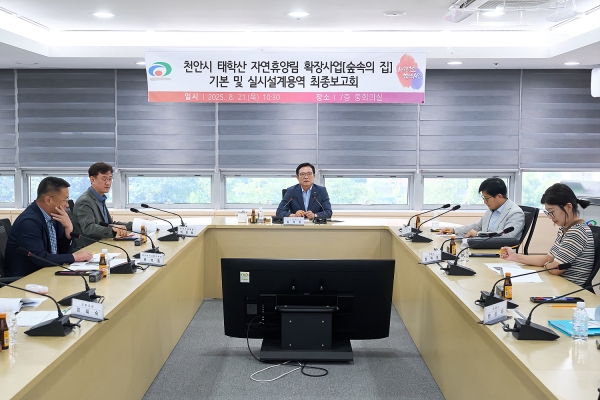 [충청중심뉴스] 천안시는 지난 21일 시청 중회의실에서 ‘태학산 자연휴양림 숲속의 집 확장사업 기본 및 실시설계최종 보고회’를 개최했다.