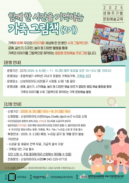 [충청중심뉴스] 대전학생교육문화원 부설 산성어린이도서관은 건강한 가족 문화 조성을 위해 2025년 생애주기별 문화예술교육 ‘함께 한 시간을 기억하는 가족 그림책’ 2기를 9월부터 세 달간 운영한다고 밝혔다.