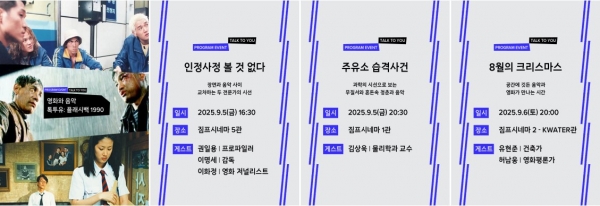 올해 ‘톡투유’ 프로그램에는 대중에게 친숙한 방송 ‘알쓸신잡’ 출연진으로도 잘 알려진 김상욱 경희대 물리학과 교수, 권일용 범죄학 박사, 유현준 건축가가 게스트로 참여해 자신만의 영화적 경험과 음악적 감상을 관객과 나눈다.
