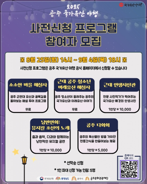 [충청중심뉴스] 공주문화관광재단은 9월 5일부터 7일까지 개최되는 ‘2025 공주 국가유산 야행’의 사전신청 프로그램 참여자를 모집한다고 밝혔다.