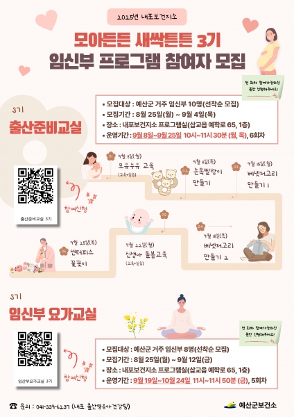 프로그램은 예산군에 거주하는 임산부 누구나 무료로 참여할 수 있으며 프로그램별 8∼10명을 선착순 모집한다.